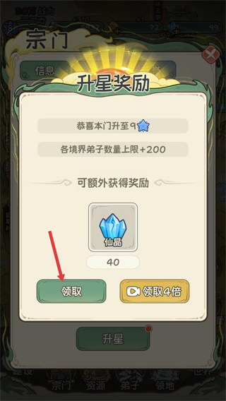 3、升星成功后會彈出升星獎勵界面,顯示宗門升至9星,弟子數量上限增加,還可領取仙晶獎勵,點擊領取按鈕即可獲取基礎獎勵,也可選擇領取4倍獎勵來獲得更多資源。