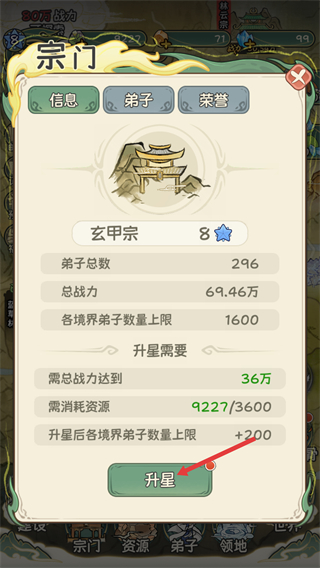 2、進入宗門界面后,可查看宗門信息,包括弟子總數、總戰力等,升星需要總戰力達標且消耗對應資源,當前條件滿足時,點擊升星按鈕即可提升宗門星級,擴展弟子數量上限。