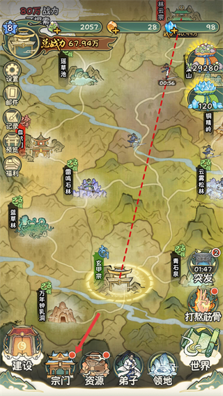 1、界面展示宗門地圖,底部有宗門等功能按鈕,當前總戰力已達67萬,點擊宗門按鈕可進入宗門界面,這是查看宗門信息、進行升星等操作的入口,助力宗門發展。
