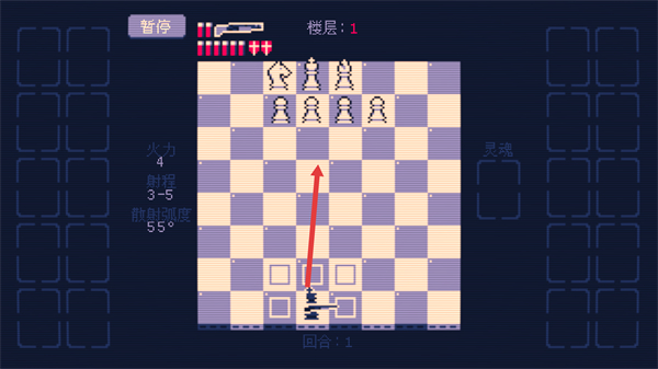 1、處于樓層1、回合1的棋盤場景,界面顯示自身火力、射程等屬性,上方有敵方棋子分布,需操控角色向上移動,規劃路徑靠近敵方棋子,為后續攻擊做準備。
