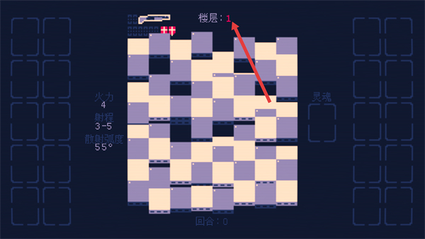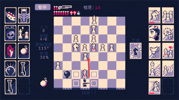 1、處于樓層10、回合7的場景,自身火力、射程等屬性有所提升,棋盤上敵方棋子密集,需利用霰彈槍的散射弧度與穿透屬性,提升生存與輸出效率。