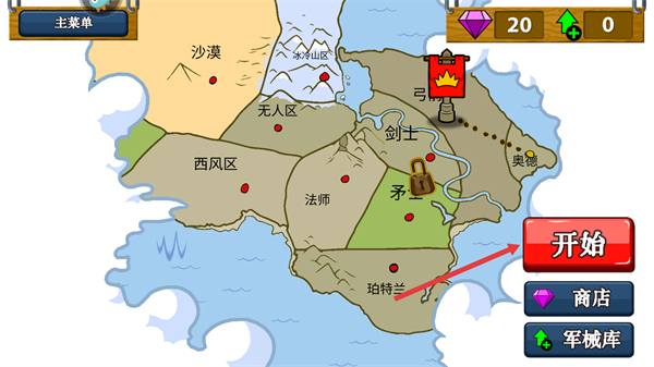 3、選擇難度后進入地圖界面,可見不同區域分布,當前僅弓手區域解鎖,其余區域處于鎖定狀態,點擊右側紅色開始按鈕,即可進入對應區域的戰斗關卡。