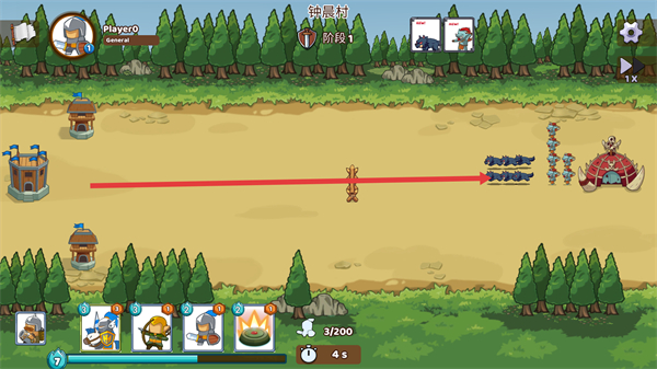 3、戰斗界面左側是己方建筑,下方有不同兵種與技能卡片,右側是敵方單位,需合理使用兵種卡片部署部隊,推進戰線擊敗敵方目標來獲取優勢。
