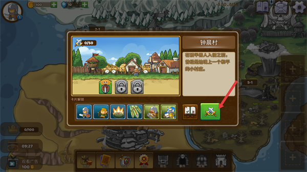 2、進入關卡后會顯示【鐘晨村】的背景介紹,下方有卡片解鎖區域,點擊綠色帶劍按鈕可開啟該關卡的戰斗,解鎖對應的戰斗內容與玩法。