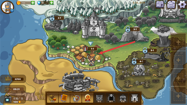 1、界面顯示資源為金幣100、鉆石10,下方有商店、部隊等功能按鈕,當前可進入的關卡是1,其余關卡處于鎖定狀態,點擊1即可進入對應關卡。
