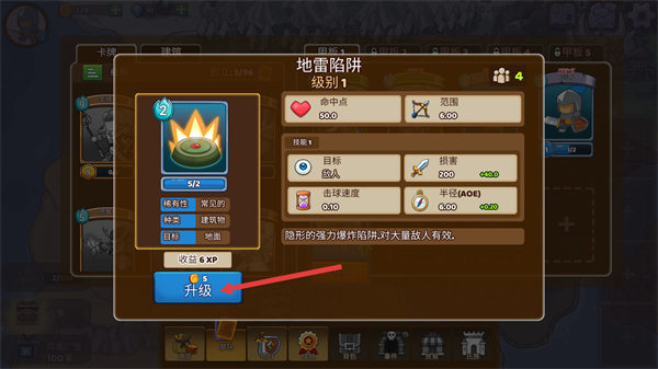 3、點擊【地雷陷阱】可查看其屬性,它是地面目標的建筑物卡牌,1級時傷害200、半徑6.00,對大量敵人有效,消耗5金幣點擊【升級】按鈕,可提升其屬性增強戰力。