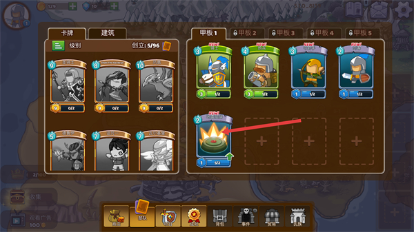 2、進入部隊界面后,左側是卡牌列表,右側甲板1已配置騎士、民兵等單位,還有【地雷陷阱】建筑卡牌,可通過調整甲板卡牌組合,搭配出更適配關卡的作戰陣容。