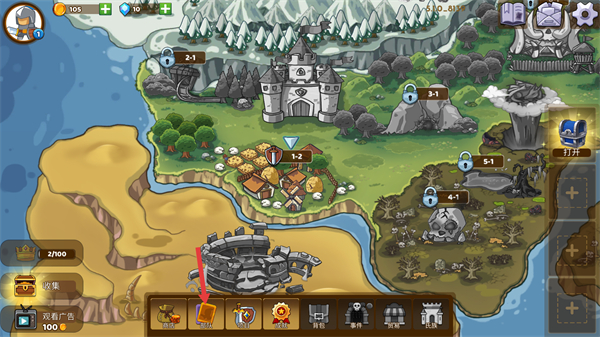 1、界面顯示金幣105、鉆石10,其余關卡仍鎖定,右側有可打開的寶箱,下方功能欄中點擊【部隊】按鈕,可進入部隊配置界面調整作戰卡牌。