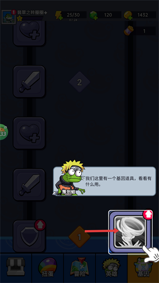 2、進入基因界面后,可看到基因道具欄,提示有基因道具可使用,點擊對應的基因道具,即可將其放入基因槽位,為后續的基因進化操作做準備,推進小蛙的變強進程。
