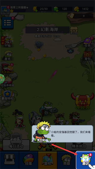 1、界面顯示當前處于【幻影海岸】關卡,底部功能欄有【基因】按鈕,根據提示可知小蛙的變強基因可覺醒,點擊該按鈕即可進入基因系統界面,開啟基因相關的養成操作。