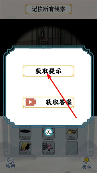 4、若推進游戲遇阻,點擊提示按鈕會彈出獲取提示和獲取答案的選項,選擇對應功能可獲取幫助以繼續推進游戲。