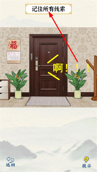 2、進入誰在說謊關卡界面,提示記住所有線索,呈現帶有福字日歷、房門等元素的場景,需觀察并記憶場景中的相關線索信息。