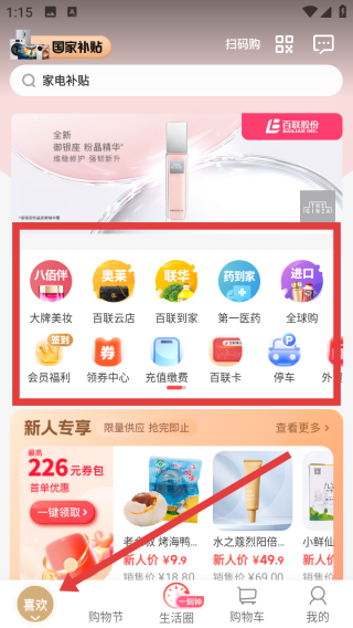1、喜歡頁面,頂部國家補貼、掃碼購便捷中間功能區超豐富八佰伴、買奧等品牌入口,涵蓋美妝、百貨、醫藥等。