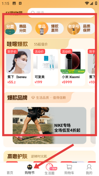 2、購物節頁面,分類標簽多樣,哇噻爆款呈現蕉下口罩、可復美面膜等超值好物,活動價誘人,爆款品牌。