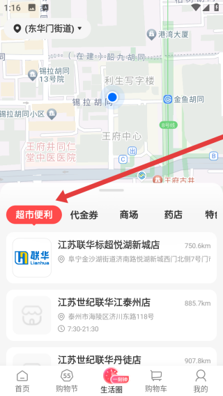 3、生活圈頁面定位東華門街道、便利分類下,羅列江蘇聯華等門店,標注距離、地址,代金券、商場等分類輔助篩選,幫用戶快速找周邊商超。