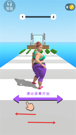 1、用手指滑動屏幕,讓角色在賽道上奔跑,開啟瘦身挑戰,朝著目標努力前進。