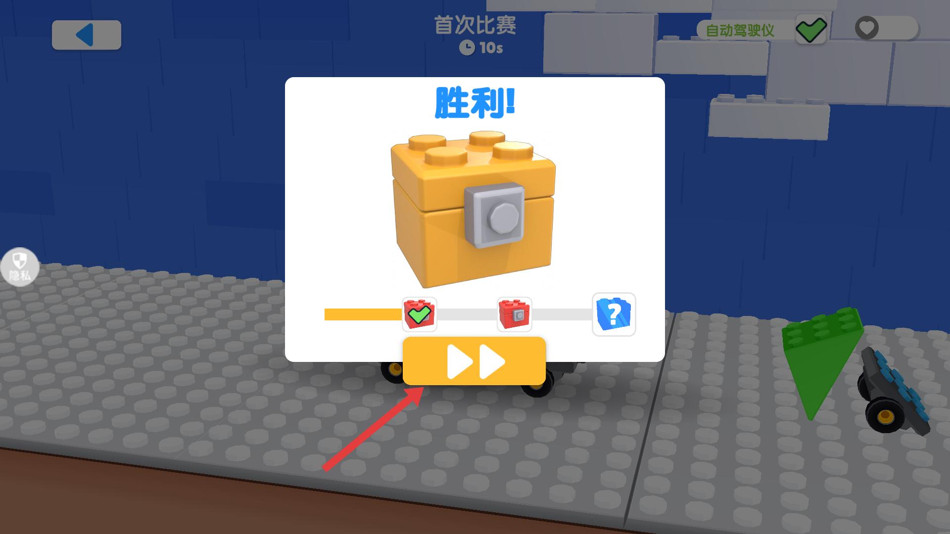 3、獲勝后,點擊箭頭按鈕,領取勝利獎勵,獲得積木寶箱等物品,為后續車輛改裝等提供資源。