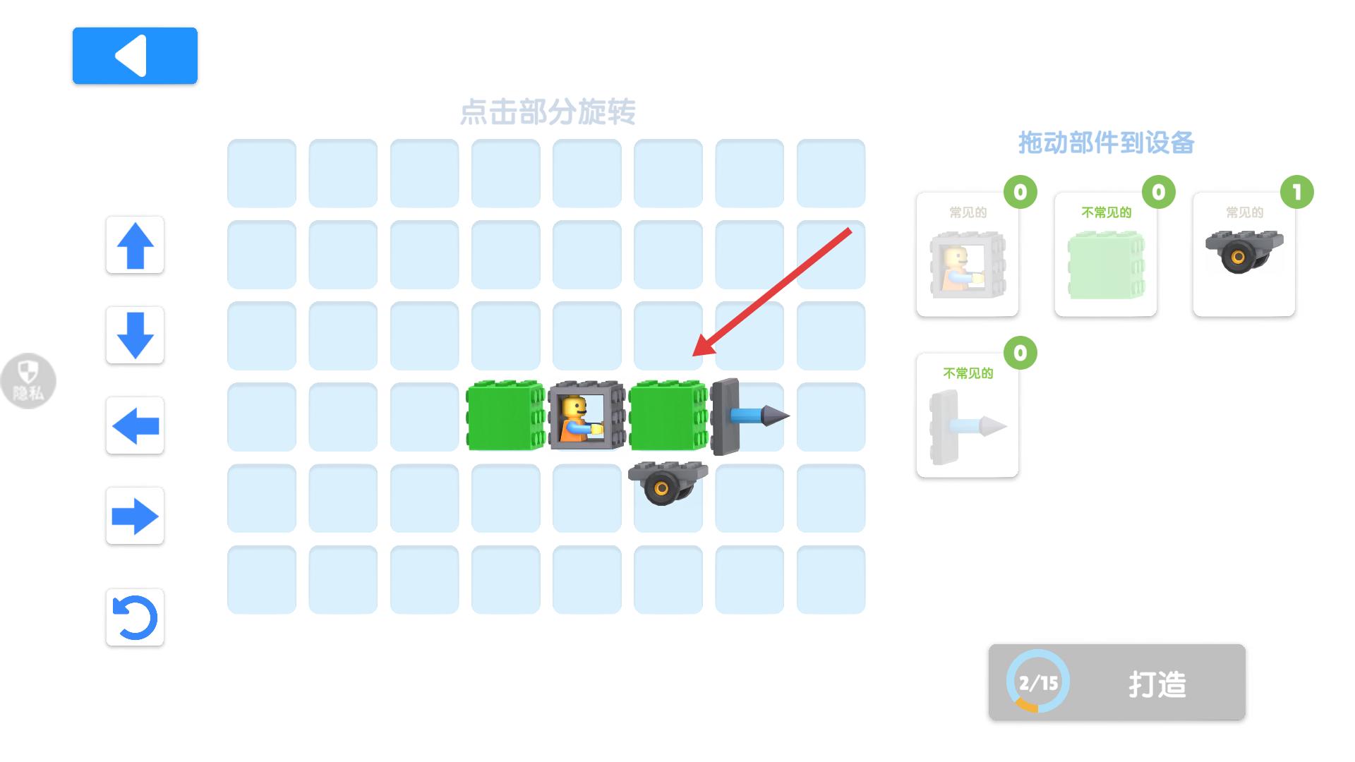 4、進入車輛改裝界面,可拖動右側不同類型的積木部件到車輛上,還能點擊部分進行旋轉,打造更具戰斗力的車輛。
