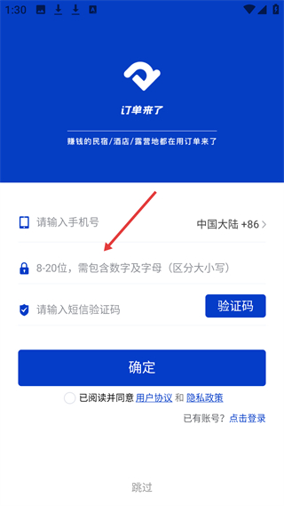 1、注冊界面,需輸入手機號、設含數字字母的密碼、填驗證碼,同意協議后點確定注冊,也可跳過。