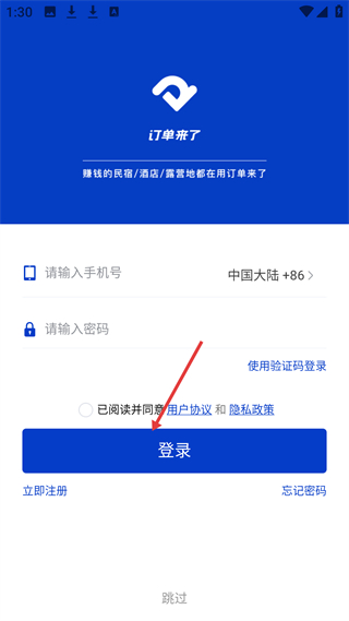 2、登錄界面,輸入手機號和密碼,同意協議后點登錄,可驗證碼登錄,有立即注冊、忘記密碼入口。