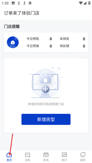 3、首頁界面,顯示體驗門店,有門店提醒,可新增房型,底部首頁導航欄選中,用于查看門店信息和操作。