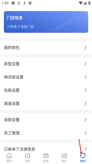 4、我的界面,顯示門店信息,有多個功能選項,底部我的導航欄選中,用于管理賬號及門店設置。