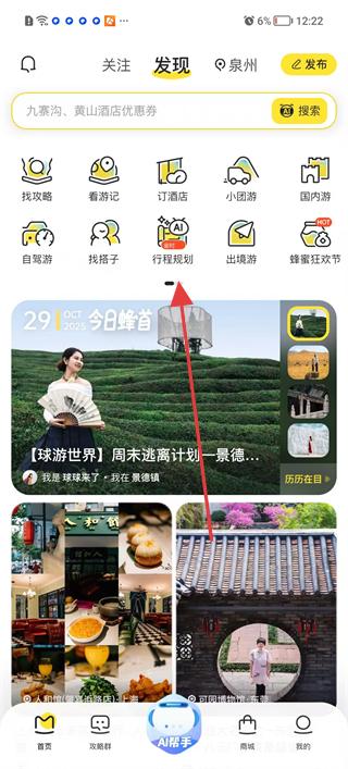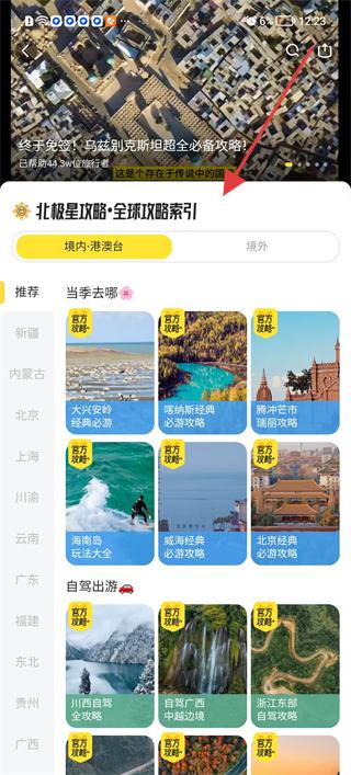 1、進入軟件發現頁面點擊行程規劃,進入北極星攻略·全球攻略索引頁面,查看境內外的旅游攻略分類,如大興安嶺、納帕海等,確定旅游目的地方向。