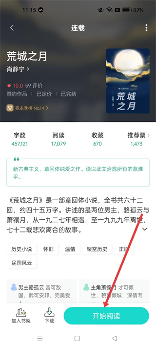 3、書籍荒城之月的詳情頁,可查看書籍評分、字數、閱讀量等信息,了解書籍簡介和標簽,可選擇加入書架、下載或開始閱讀。