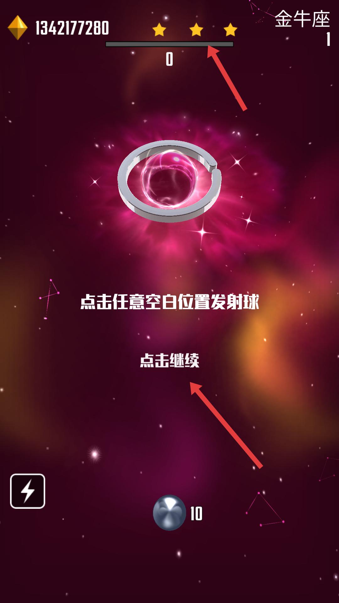 3、提示點擊任意空白位置發射球,點擊繼續,后續可通過點擊空白處發射球,擊打星環等目標。