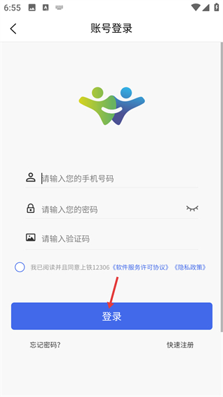 1、進入賬號登錄界面,需輸入手機號碼、密碼與驗證碼,勾選上鐵12306相關協議后點擊登錄,也可選擇忘記密碼或快速注冊操作。