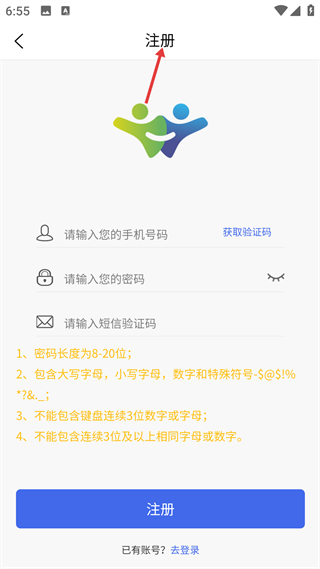 2、進入注冊界面需輸入手機號并獲取驗證碼,設置符合長度及復雜度要求的密碼,填寫短信驗證碼后點擊注冊,已有賬號可選擇去登錄。