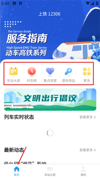 3、進入首頁可見服務指南板塊,包含車站大屏、時刻表等功能,還有列車實時狀態及最新動態板塊,可獲取鐵路出行相關信息。
