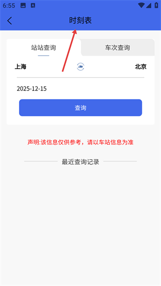 4、進入時刻表界面有站站查詢和車次查詢選項,輸入出發地、到達地與日期后點擊查詢,信息僅供參考,還可查看最近查詢記錄。