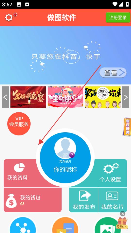 1、做圖軟件個人頁,顯示免費會員身份及昵稱,有我的資料,個人設置等功能區,還可進入VIP會員服務,管理賬號相關內容。