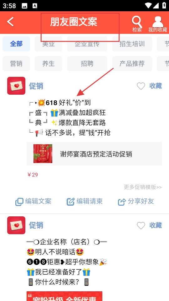 2、朋友圈文案頁,分類展示營銷文案,如618促銷文案,含滿減、爆款直降等內容,支持編輯、收藏、分享,助力打造吸睛朋友圈。