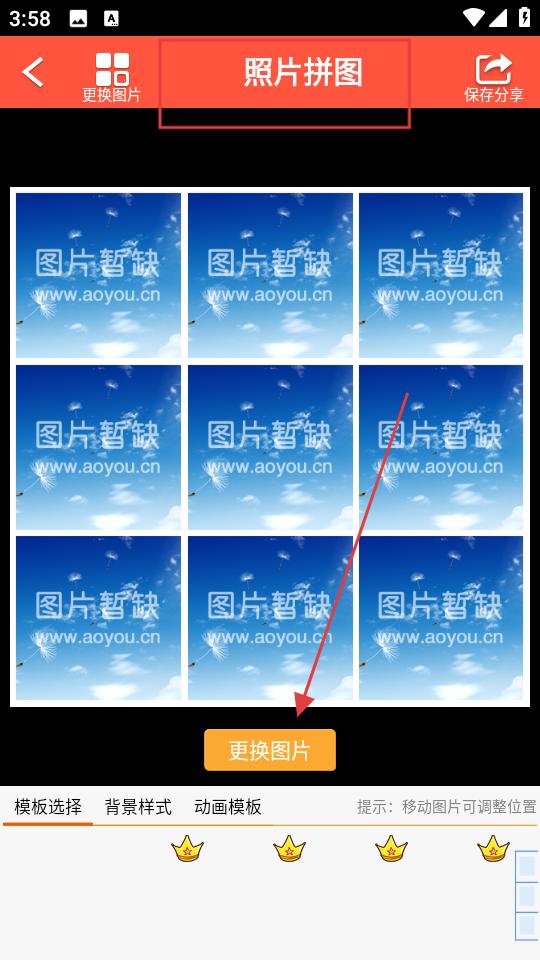 3、照片拼圖功能頁,呈現拼圖模板,可點擊更換圖片替換內容,還能選背景樣式、動畫模板,制作個性化拼圖并保存分享。
