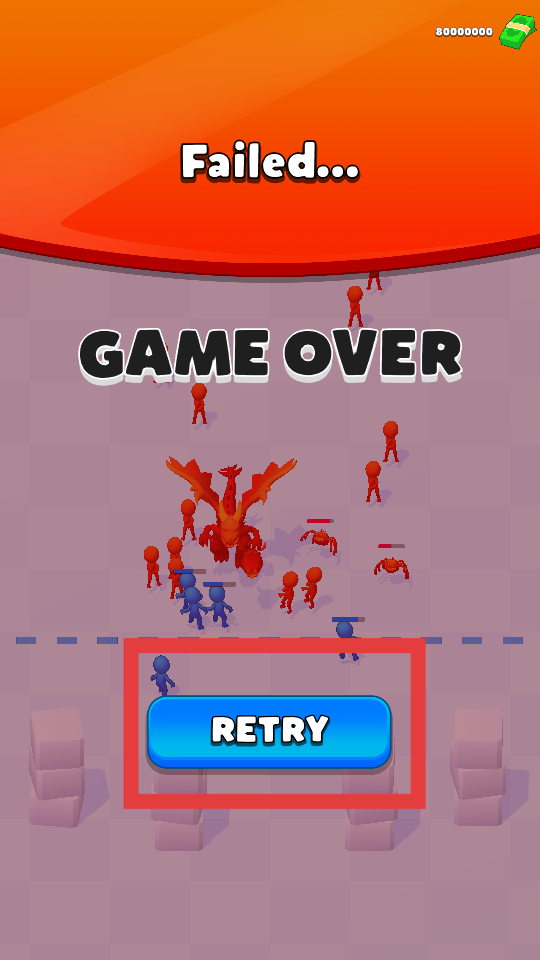 4、玩家如果游戲戰斗失敗,點擊RETRY按鈕可重新開始當前戰斗,讓你有機會調整策略,再次挑戰對手。