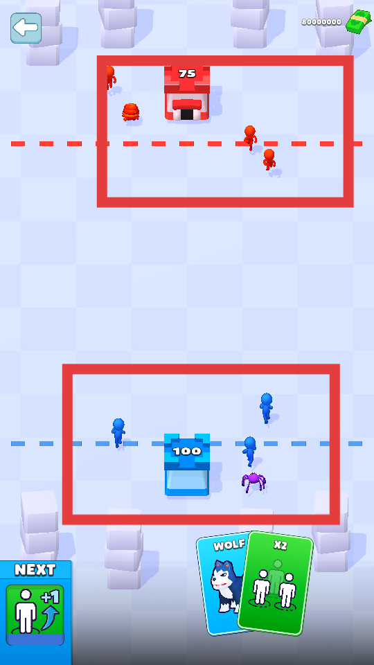 2、戰斗中存在紅藍雙方陣地藍色陣地有己方單位和建筑,紅色陣地是敵方區域需守護己方陣地,同時突破敵方陣地,建筑的數值能關聯防御或兵力產出。