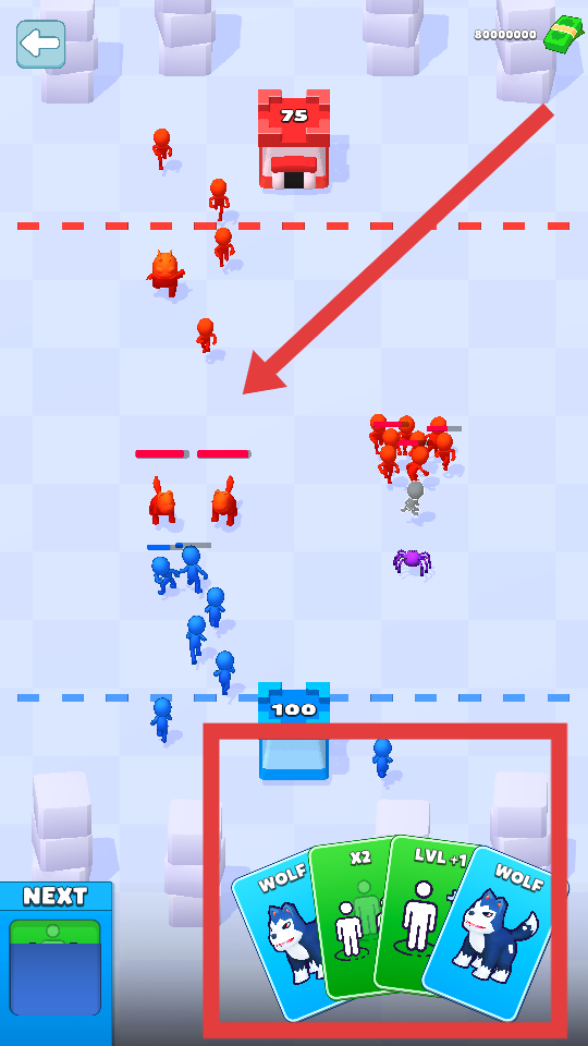 3、戰斗時下方有卡牌WOLF卡牌可召喚狼助力戰斗也能提升單位等級、增加兵力合理選擇和釋放卡牌,搭配陣地攻防左右戰斗勝負。