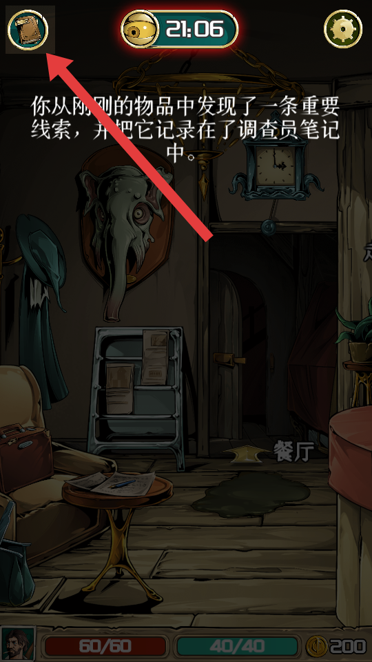 4、點擊左上角的調查員筆記圖標,可查看從物品中發現的重要線索,幫助梳理游戲中的關鍵信息,更好地進行冒險探索。