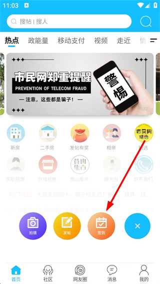 2、點擊加號可展開拍攝、發帖、簽到等功能選項,可根據需求進行拍攝分享、發帖互動或簽到獲取福利。