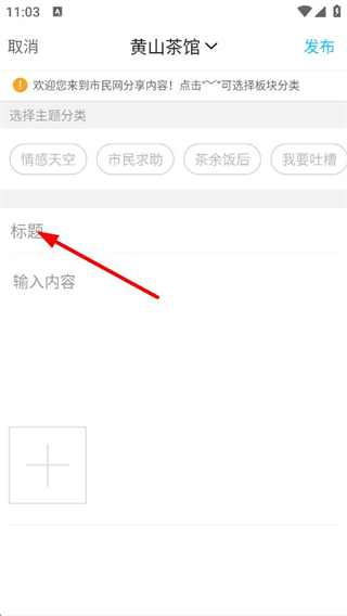 3、發帖界面,可選擇主題分類,如情感天空、市民求助等,輸入標題和內容后可發布帖子,參與社區互動。