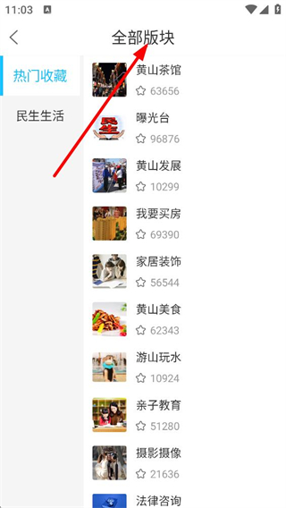 4、進入全部版塊頁面,可看到黃山茶館、曝光臺等多個版塊,包含民生生活、房產、美食等領域,可選擇感興趣的版塊參與討論。