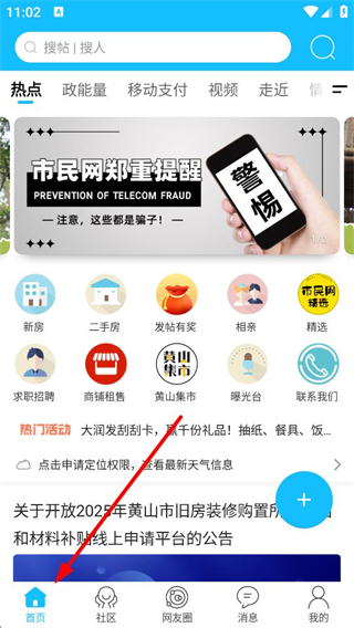 1、進入首頁可看到熱點、政能量等分類標簽,還有新房、二手房等功能入口,下方呈現各類本地資訊和熱門活動,能便捷獲取本地生活信息。