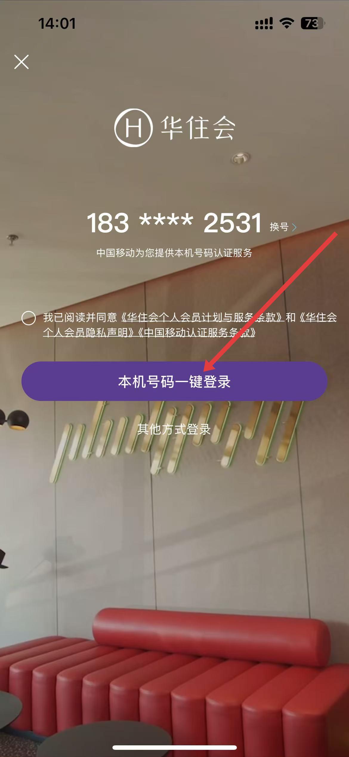 4、登錄界面,可選擇本機號碼一鍵登錄,也可換號或選擇其他方式登錄,登錄后可使用華住會的各項服務。