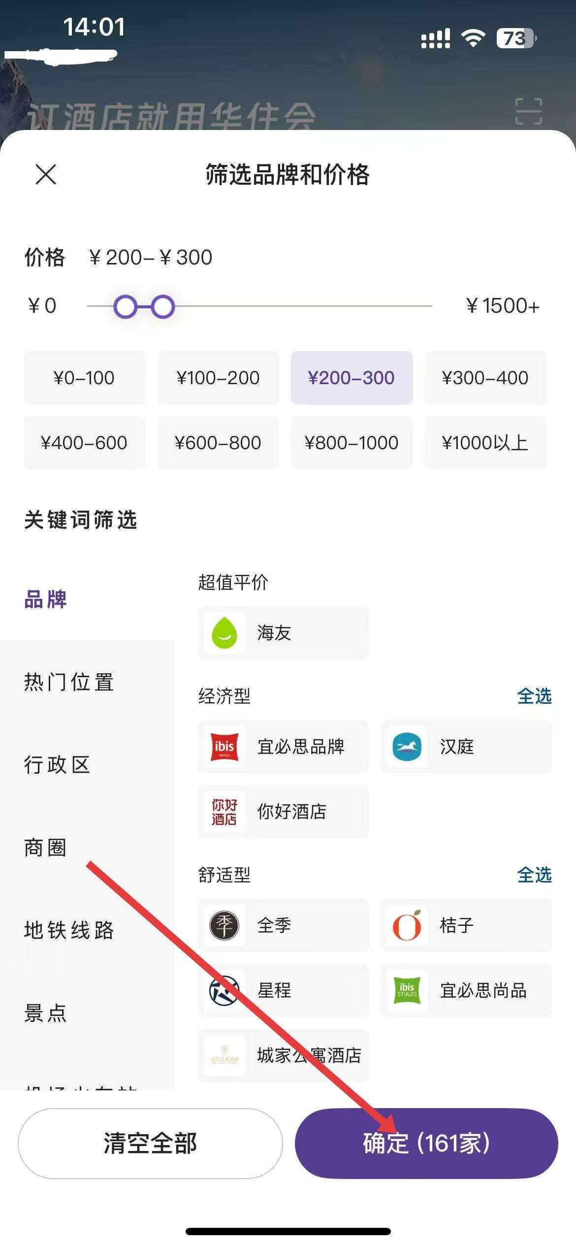 2、篩選品牌和價格界面,可設置200-300元等價格區間,選擇海友、漢庭等品牌,點擊確定可篩選出符合條件的酒店。