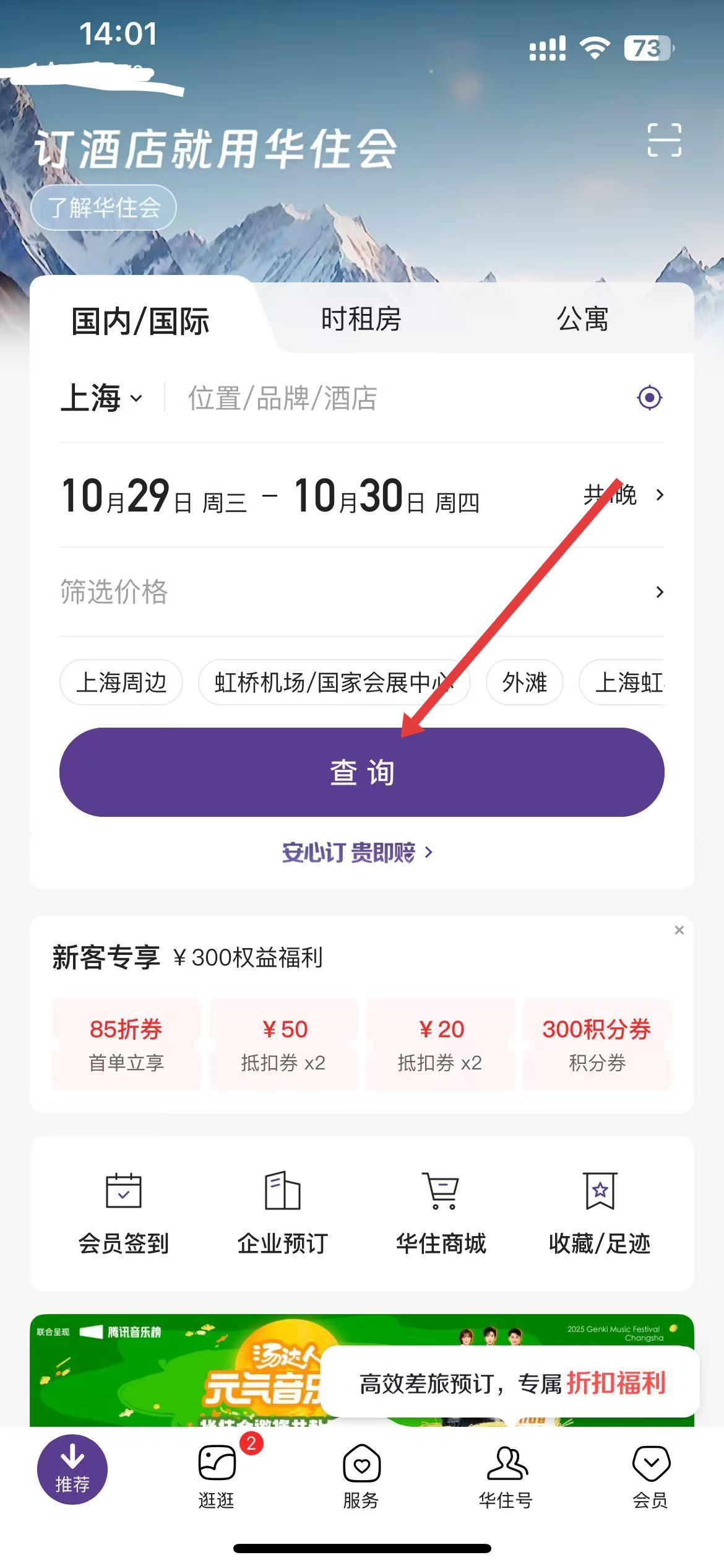 1、進入華住會首頁,可選擇國內、國際、時租房、公寓等房型,設置上海等城市及入住日期,點擊查詢可搜索酒店。