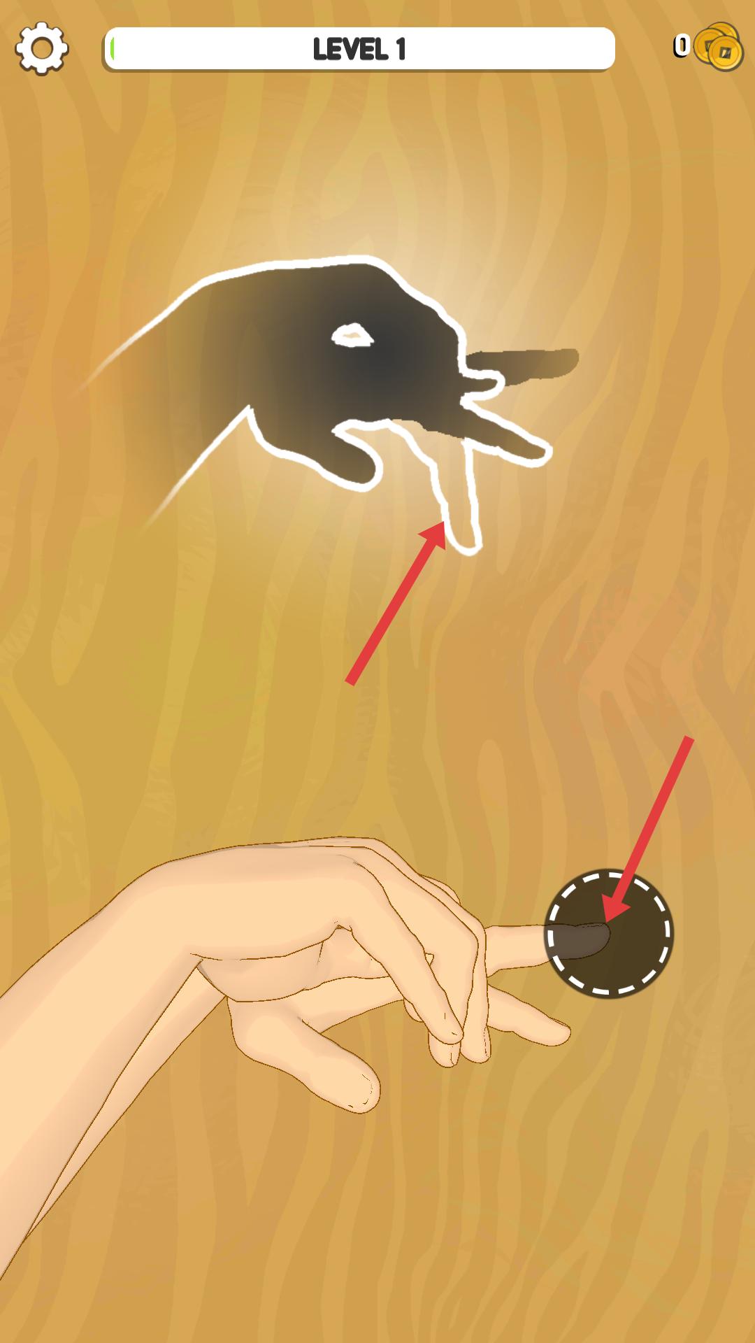 1、游戲第一關,需按照提示,用手指操作,模仿上方黑色手影的形狀,將手指放入對應的圓形區域,完成手影模仿來推進游戲。