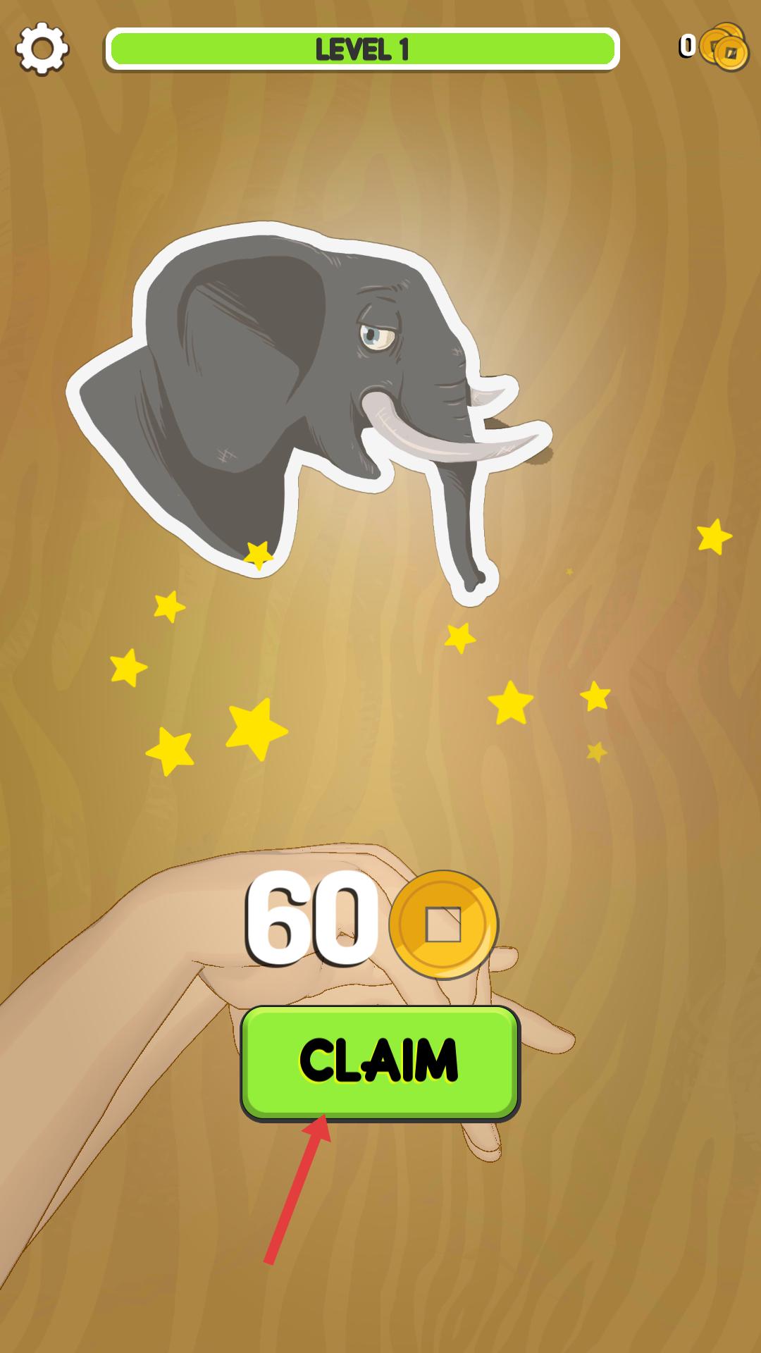 2、成功模仿手影后,會出現大象圖案,此時點擊綠色的【CLAIM】按鈕,可領取60枚金幣獎勵,為后續游戲積累資源。