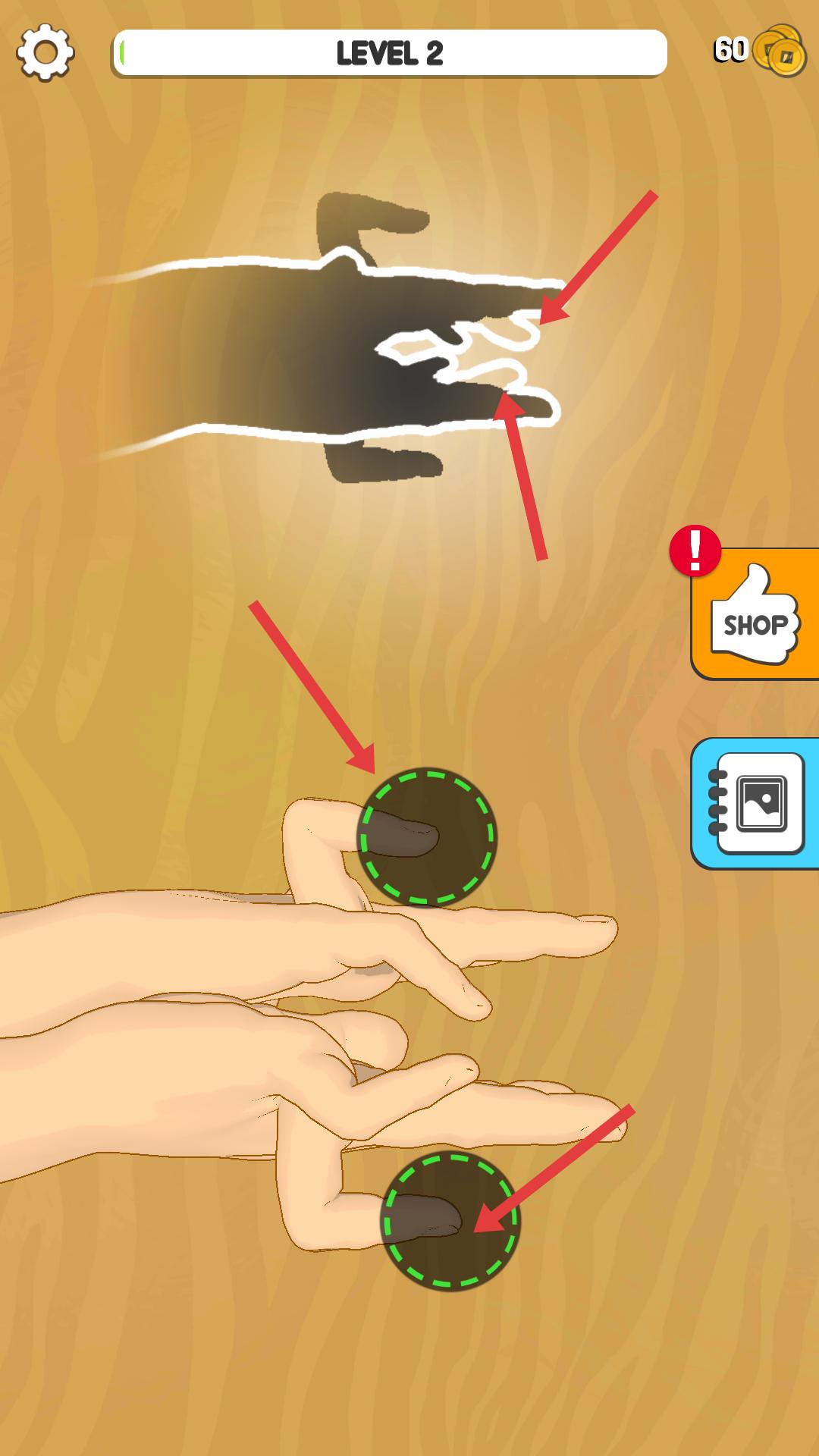 3、進入第二關,要根據上方黑色手影的形狀,同時操作兩只手,將手指分別放入對應的圓形區域,精準模仿手影造型。